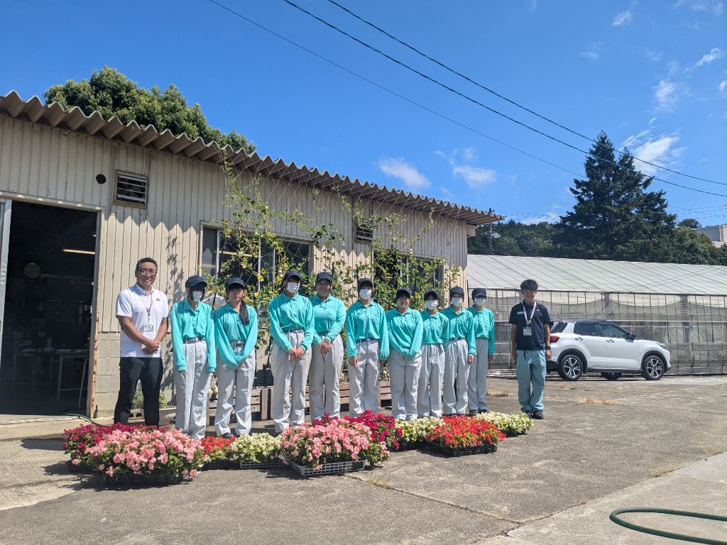 8/26(月)園芸科草花分野の生徒たちが、令和7年度に開催される「わたSHIGA輝く国スポ・障スポ」で飾られる花苗の引き渡し式に参加しました。この式は大会本番を翌年に控えたプレ大会開催に伴う行事の一つで、県内の農業高校の生徒たちが育てた花苗を小中学校へ渡し、来年の大会ではプランター花壇として会場を彩る取り組みです。生徒たちは大会期間中に花が開花期を迎えるように昨年度から入念な計画と栽培管理を重ねてきました。生徒たちが丹精込めて育てた花苗が、本大会を華やかに彩ってくれることを願っています。