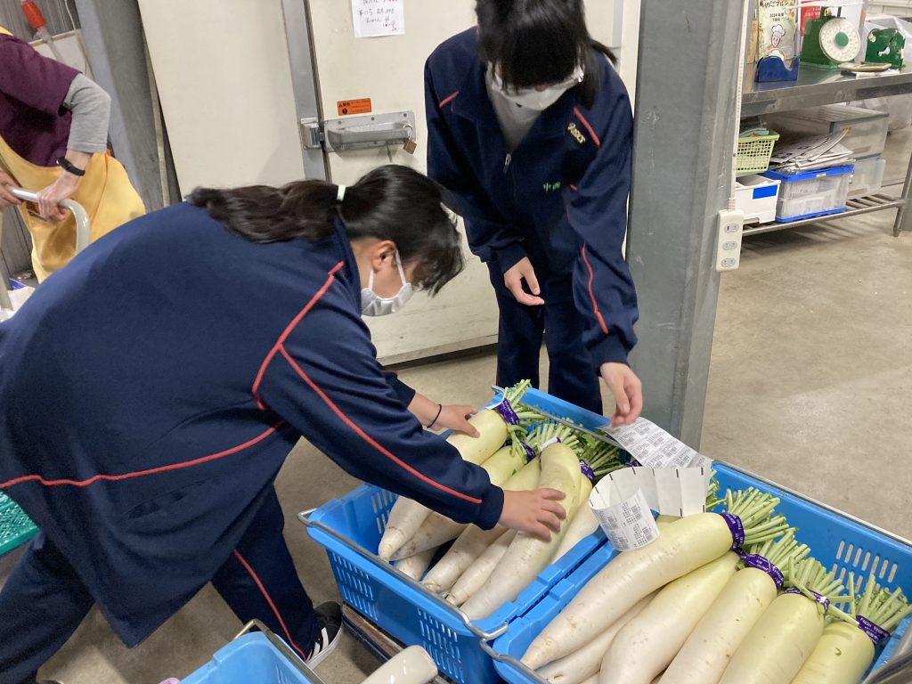 また、西野水道からの帰り道に産直びわ様に立ち寄り、収穫・出荷したキュウリやダイコンに値札のシール張りや陳列を体験し、自分たちが播種からお客様まで届けることを学習しました。