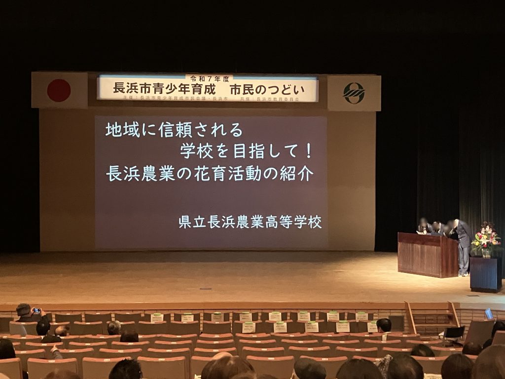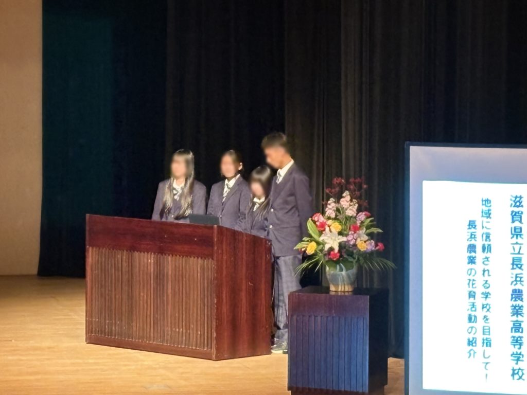令和7年11月29日(土)浅井文化ホールにて行われた、令和7年度「長浜市青少年育成 市民のつどい」において、園芸科2年生4名が発表を行いました。学校概要と、花育(はないく)活動について紹介しました。来場者の方にあたたかい拍手をいただき、緊張しながらも、楽しく発表できました。