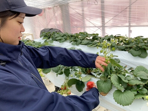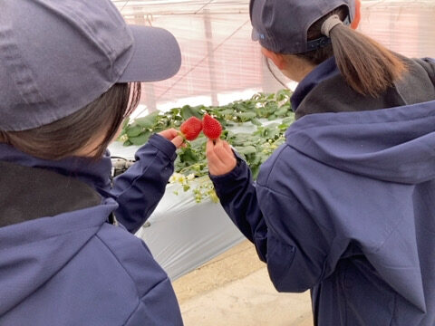 野菜分野ではイチゴを栽培しています。美味しいイチゴ生産を目指し、前年度から日本野菜ソムリエ協会が主催する「全国いちご選手権」に出品しています。今年度も出品を来週に控え、最後のイチゴの栽培管理を行いました。