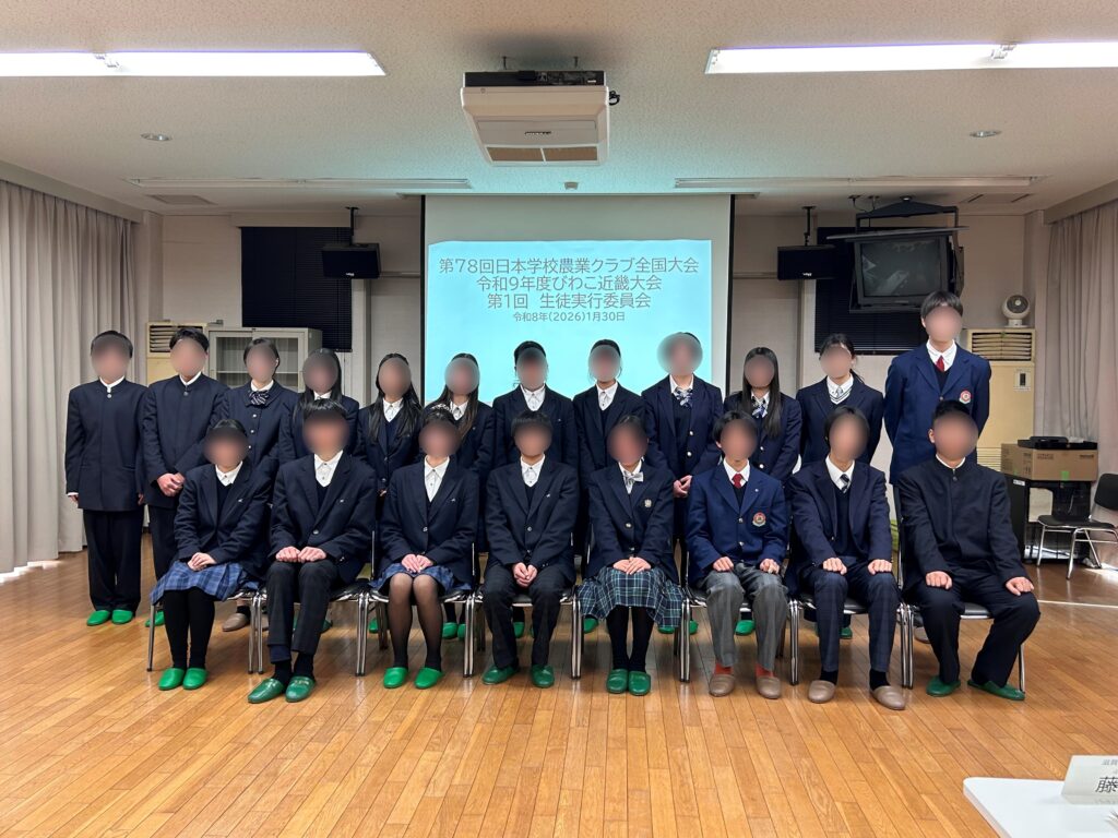 令和9年度日本学校農業クラブ全国大会に向けて滋賀県立湖南農業高等学校で第1回生徒実行委員会が開催され、本校からも実行委員の生徒3名が出席しました。滋賀県内の各農業高校と京都府、奈良県の生徒実行委員が集まり、親睦を深めながら全国大会に向けて会議を行いました。