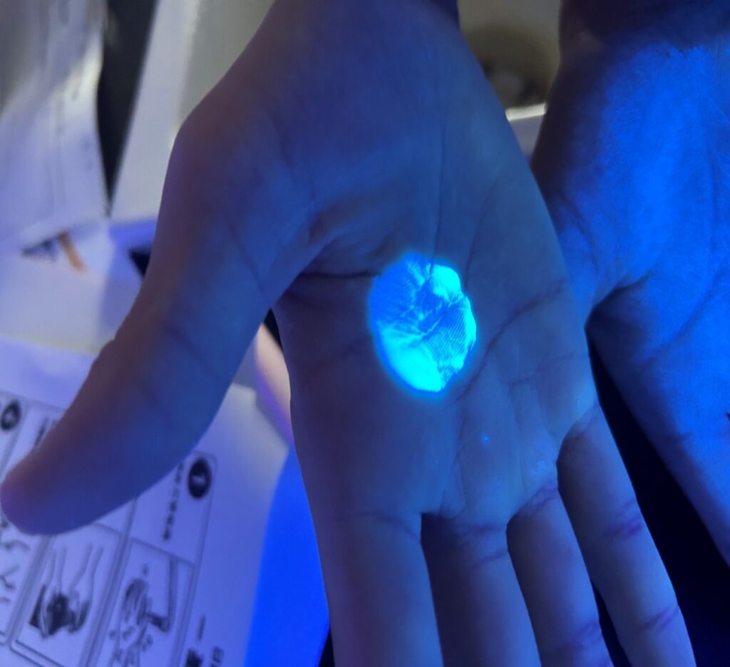 手洗いチェッカーを用いた手洗い指導や、鶏肉を用いた加熱温度と調理時間の違いによる食味の変化と衛生的検証、働く上での調理人としての思いなどを講義していただきました。