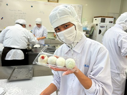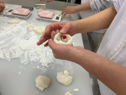 1月26日、2月6日の2日間に分けて、菓子職人による和菓子製造の体験実習を実施しました。当日は㈱常喜家様をお招きして、フルーツ大福の製造を行いました。雪平でフルーツやあんこ、生クリームなどを包み、味も見た目も魅力がたくさん詰まったフルーツ大福ができあがりました。
