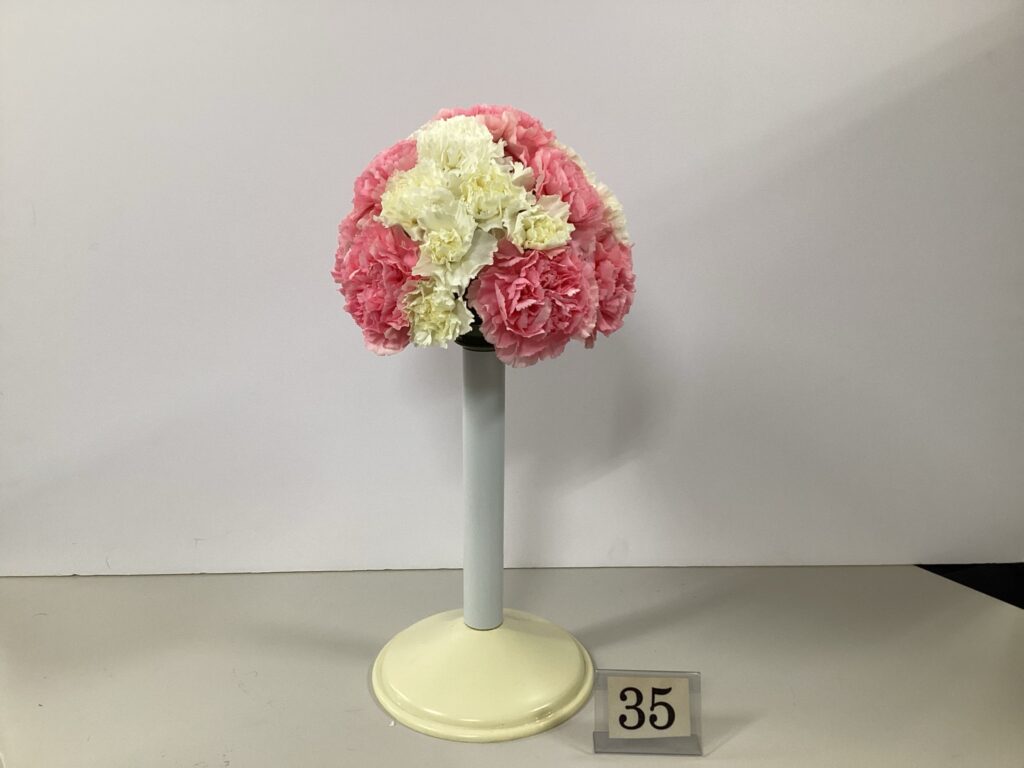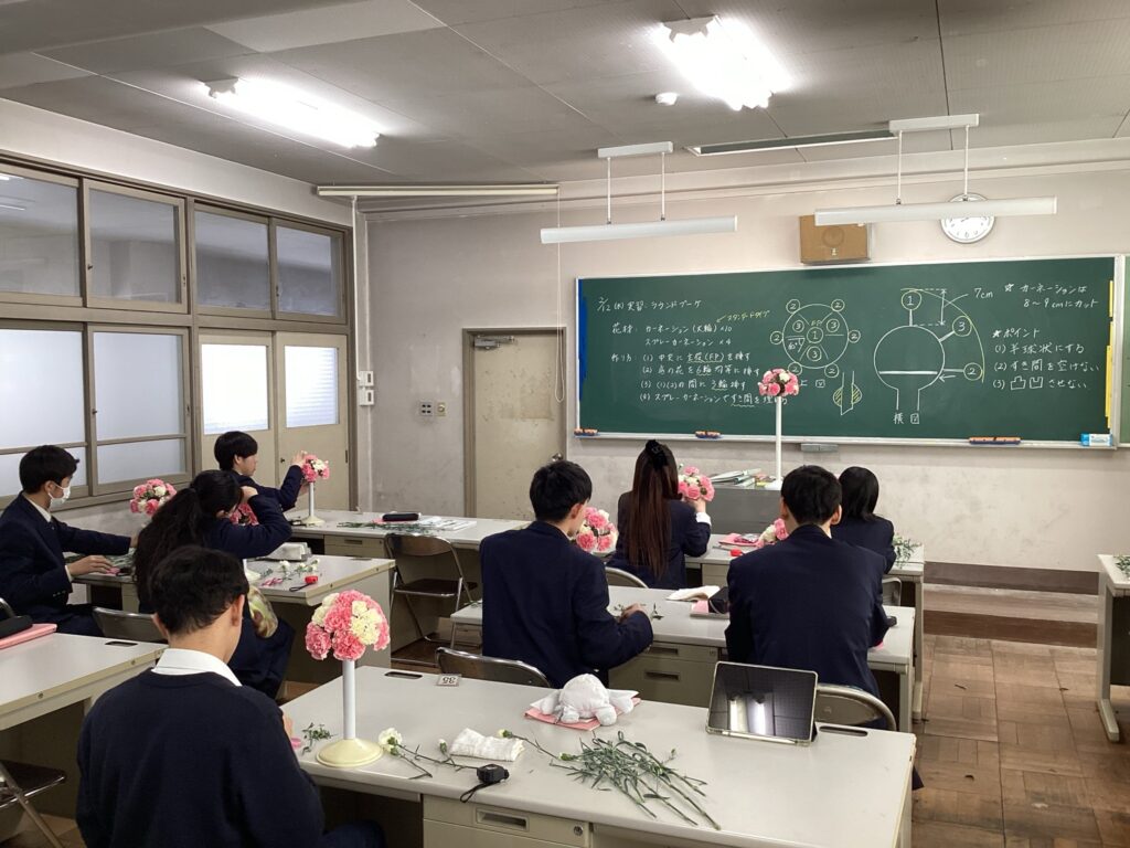 園芸科1年生の科目である「園芸装飾」の授業でフラワーアレンジメントのブーケを制作しました。前回の授業でブーケについて学習した内容を実習で実践してもらいました。生徒たちは綺麗なドーム型のブーケになるよう花の配置や空間を意識して制作をしました。