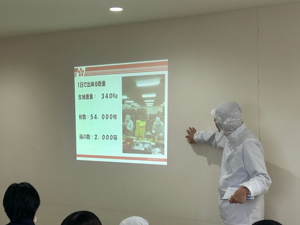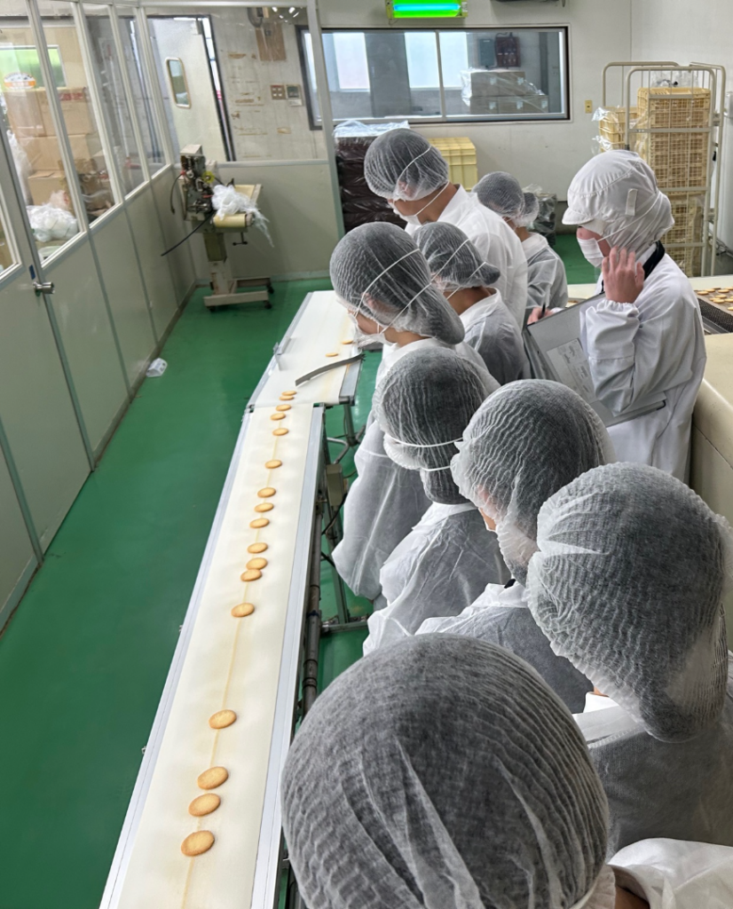 関連企業では京都宝製菓栗東工場で見学させていただきました。企業の厳しい衛生管理概念や原材料から製菓ができるまでの工程を間近で学ぶことができました。
